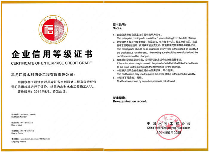 【公司简讯】:2014年9月22日,中国水利工程协会为我公司颁发了《水利水电工程施工AAA级企业信用等级证书》。此证书是企业信用等级评价和信用状况评定结果的书面证明形式。